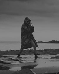 • Person wearing a black Dryrobe® changing robe on a beach with ocean waves in the background