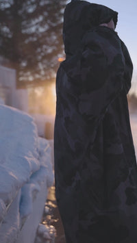 Person wearing a camouflage Dryrobe® changing robe with a brand logo standing by a body of water.