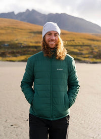*MALE* Man stood on a beach, wearing dryrobe® Thermal Trousers and dryrobe® Mid-Layer Jacket in Hunter Green