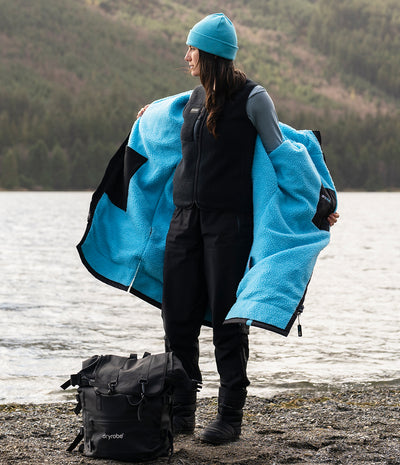 Female wearing Dryrobe® fleece gilet underneath Dryrobe® mid-layer jacket